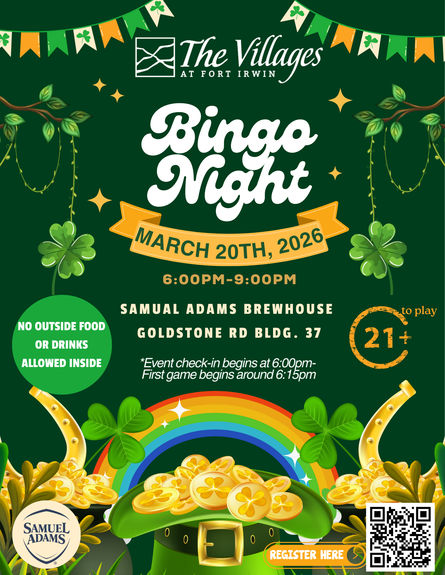 Bingo Night Friday, March 20, 2026 6:00 PM 9:00 PM The Villages at Fort Irwin 4553 Tippecanoe Street Fort Irwin, Ca 92310 United States (map) Google Calendar ICS Bingo Night is back! This time with a Saint Patrick’s Day theme! Wear your lucky green! Will this be your lucky Bingo night to finally win your pot of gold?! It is sure to be a fun time!RSVP: https://forms.gle/ridVnX7t3TescK3G9