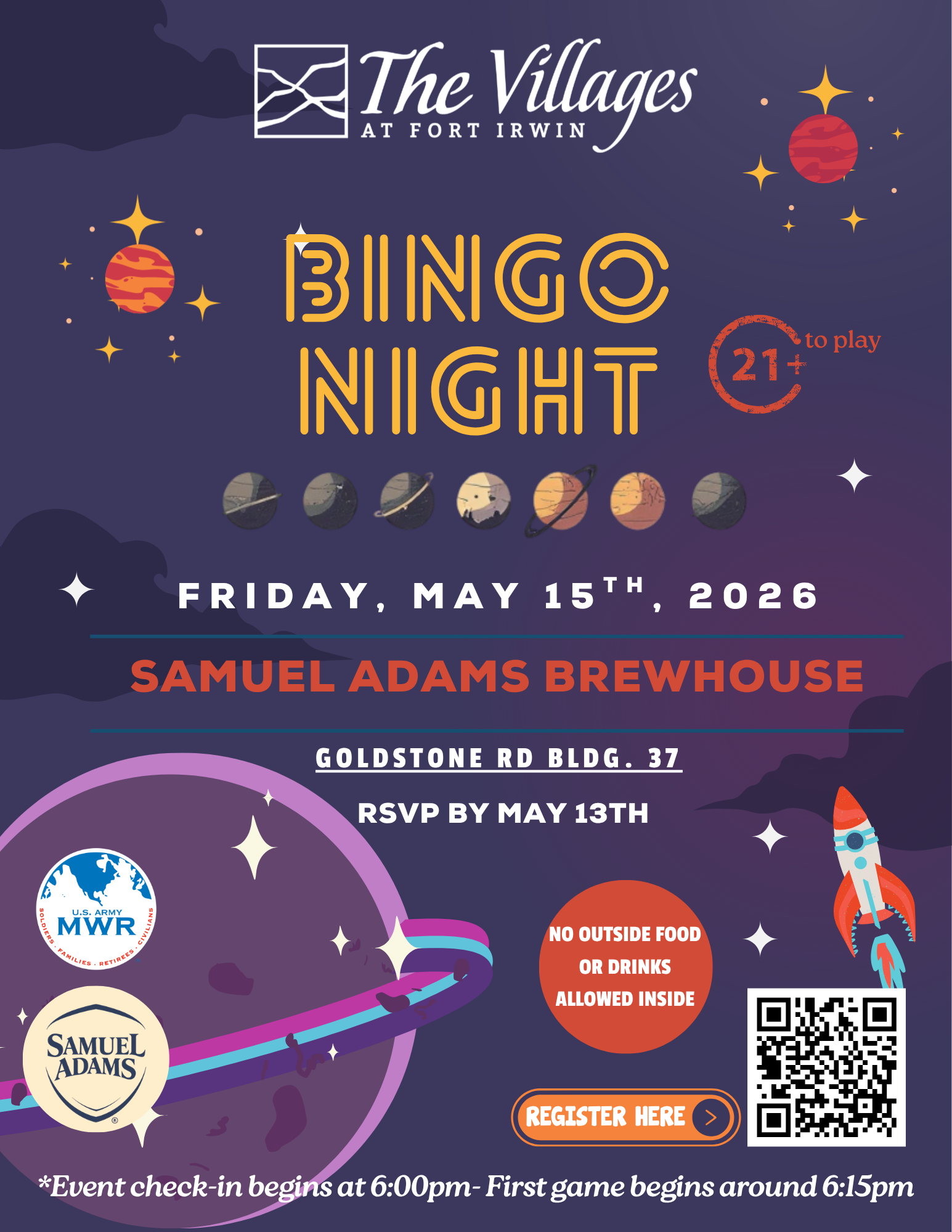 Back to All Events Bingo Night Friday, May 15, 2026 6:00 PM 9:00 PM The Villages at Fort Irwin 4553 Tippecanoe Street Fort Irwin, Ca 92310 United States (map) Google Calendar ICS RSVP at https://forms.gle/GGGQj45QKKkeX1qw5