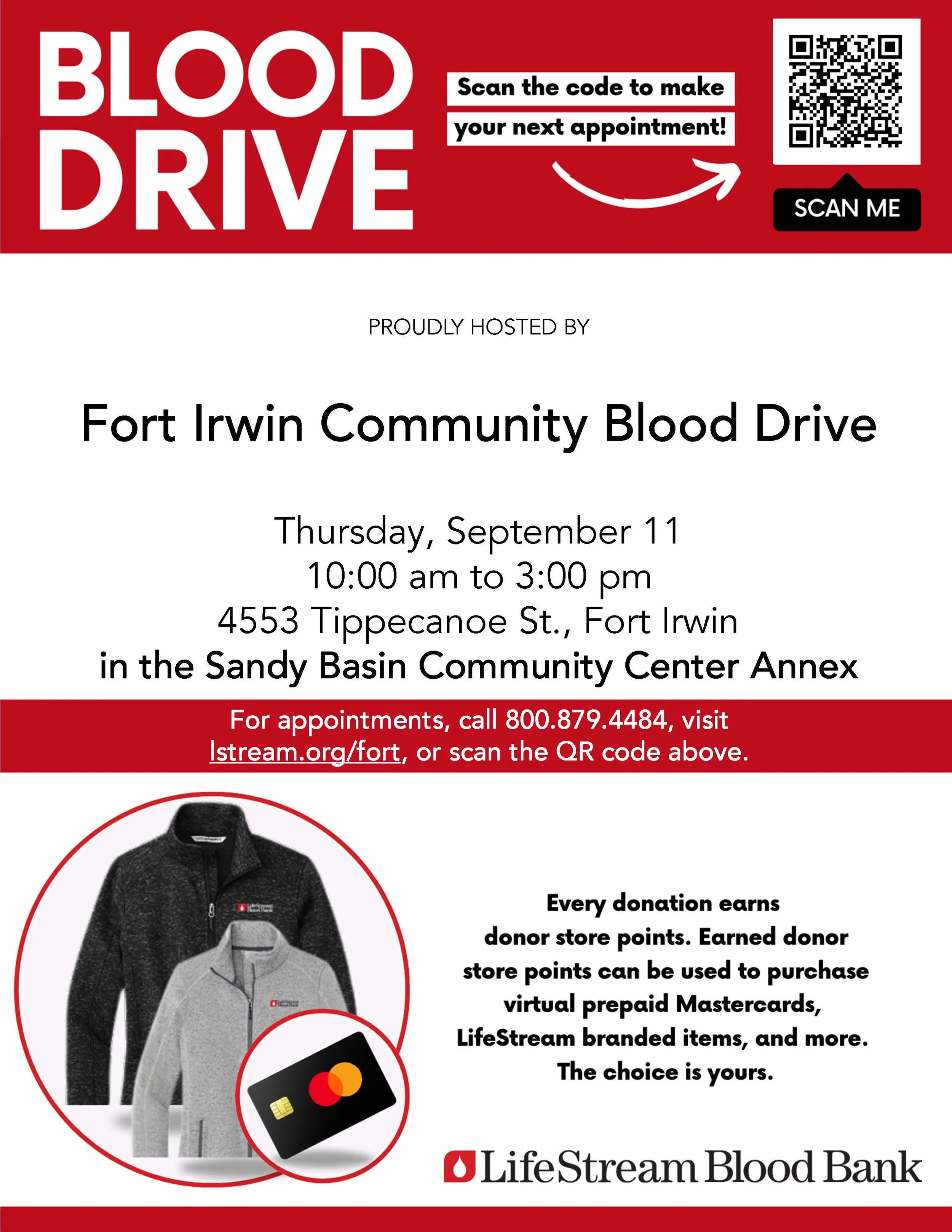 Blood Drive Thursday, September 11, 2025 10:00 AM 3:00 PM The Villages at Fort Irwin 4553 Tippecanoe Street Fort Irwin, Ca 92310 United States (map) Google Calendar ICS Sign up here: https://giftoflife.lstream.org/donor/schedules/drive_schedule/119255